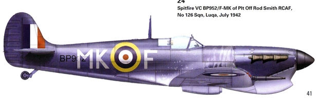 FF 17-3-42 8MU 19-3-42 82MU 28-3-42 'Guido' 7-4-42 Gibraltar 20-4-42 flown off 'HMS Eagle' to Malta 9-5-42 126Sq 'MK-F' Ran into hole and u/c collapsed Luqa CA 17-5-42 Sgt AP Goldsmith (RAAF) safe. e/f abandoned 90ml SE of Malta after e/f CE 19-11-42 P/O GH Kelly (RCAF)+ (drowned)