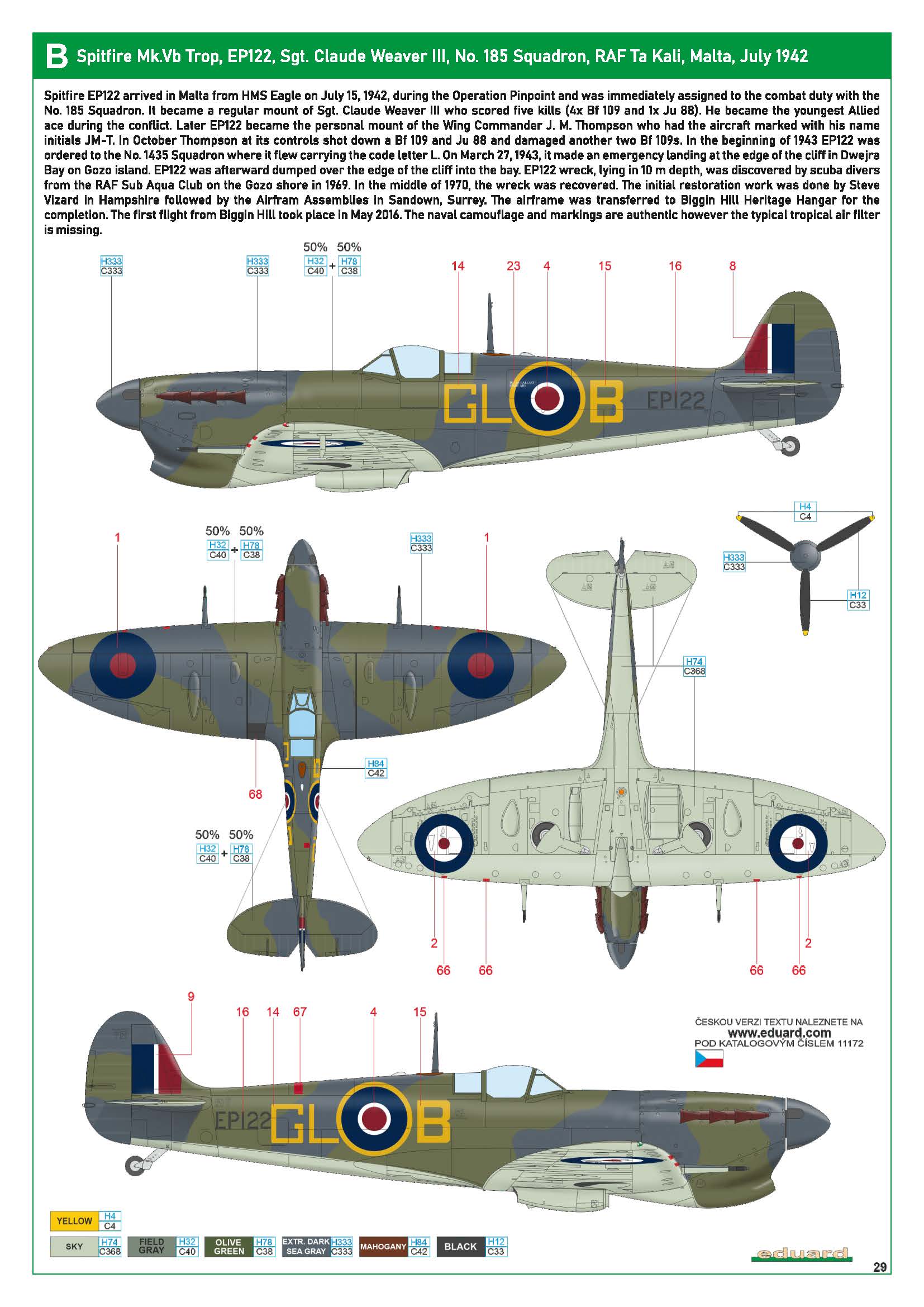 39MU 24-5-42 47MU 8-6-42 'Guido' 12-6-42 Gibraltar 25-6-42 flown off 'HMS Eagle' to Malta 15-7-42 185Sq 21-7-42 1435Sq 'V-O' by 19-11-42 'V-L' e/f crashlanded on Gozo CE 27-3-43 FSgt P Stratford (RNZAF) inj SOC 4-4-43