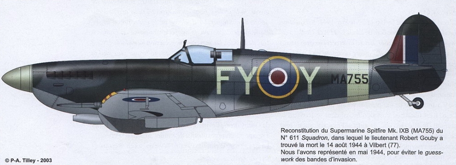 331Sq 'FN-W' 17-7-43 AST 23-2-44 33MU 27-4-44 611Sq Sweep to Paris Shot down when attacking MT nr Chagnes 14-8-44 Lt RB Gouby (DFC)+ | |