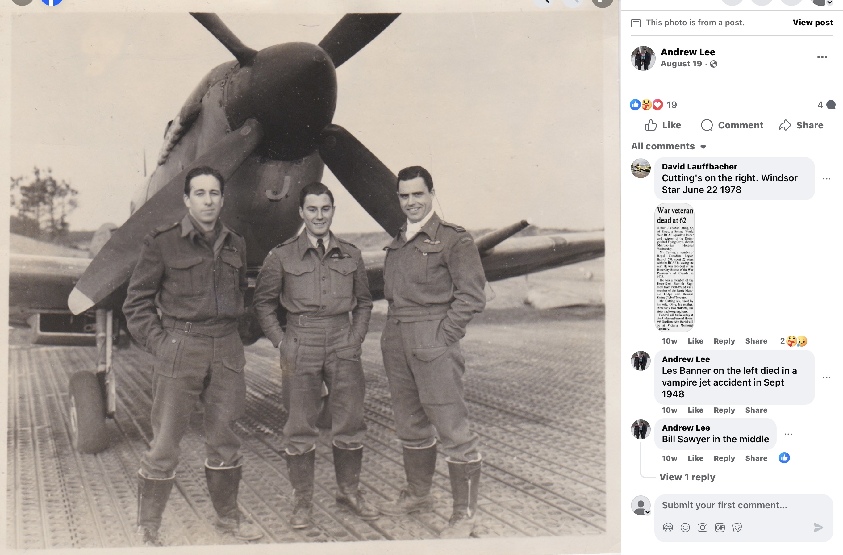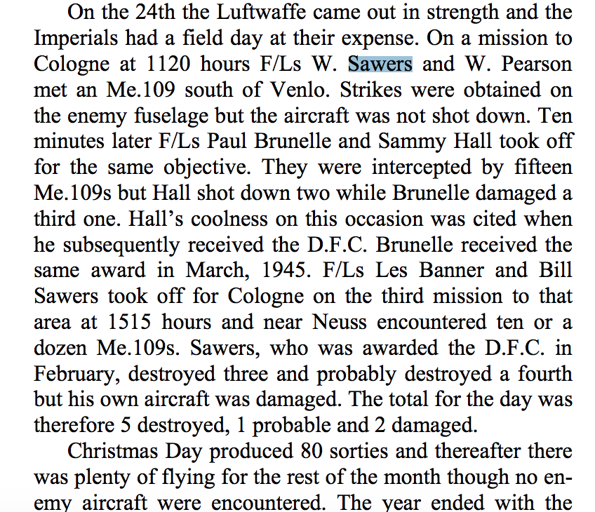 Second link right (backtonormandy) indicates Sawers died (KIA) in circumstances unknown, aircraft abandoned over the English Channel. But another link (cieldegloire.com) indicates the same incident in MK924 as engine failure with glide to allied territory, pilot returned to Canada Sept 26 1945, left the RCAF Nov 1.