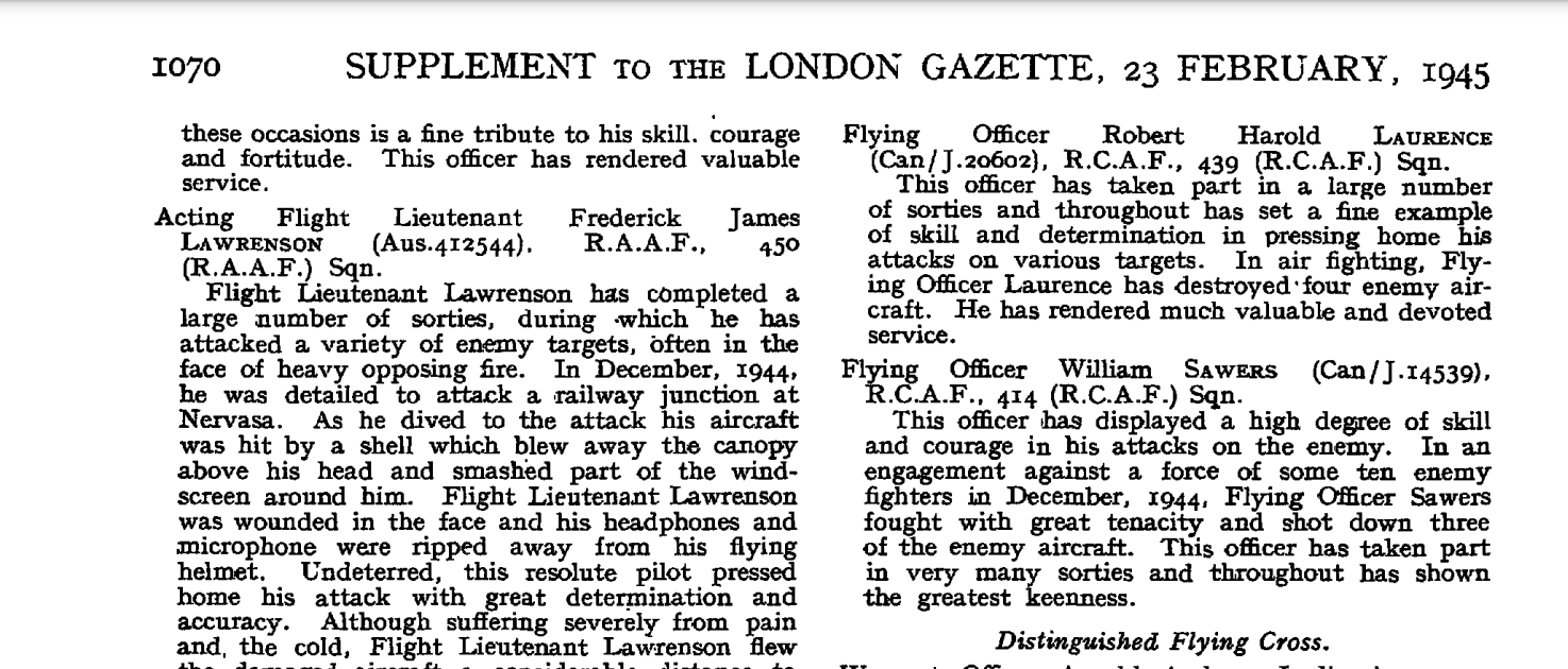 "Recce" pilot in MJ966 in 414 Sqd. based at Eindhoven, flying FR IXC recon conversion of Spitfire, armed. In combat near Cologne on Christmas Eve 1944, made five claims on Bf.109s in single sortie, 3 confirmed, 2 dammaged. DFC.