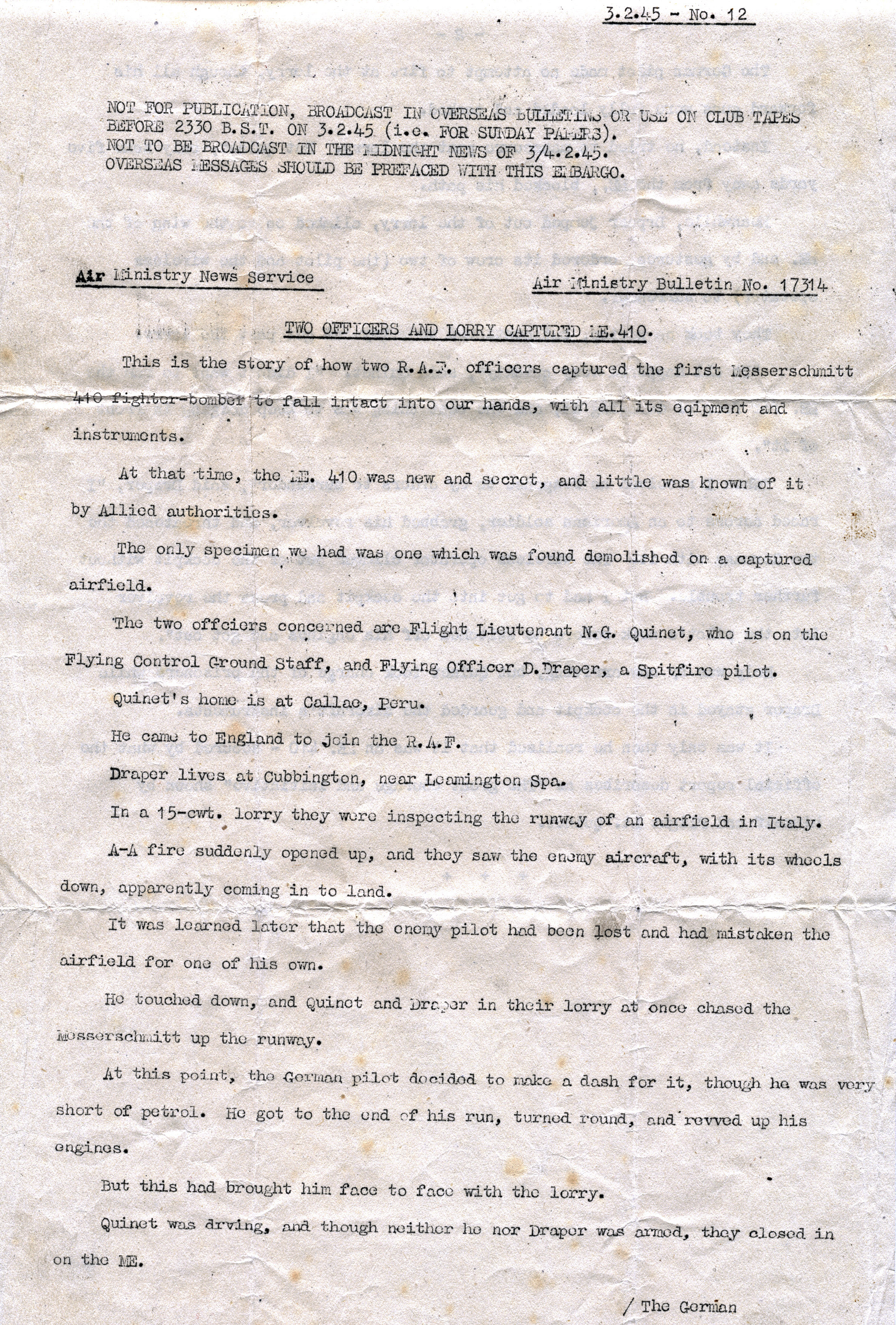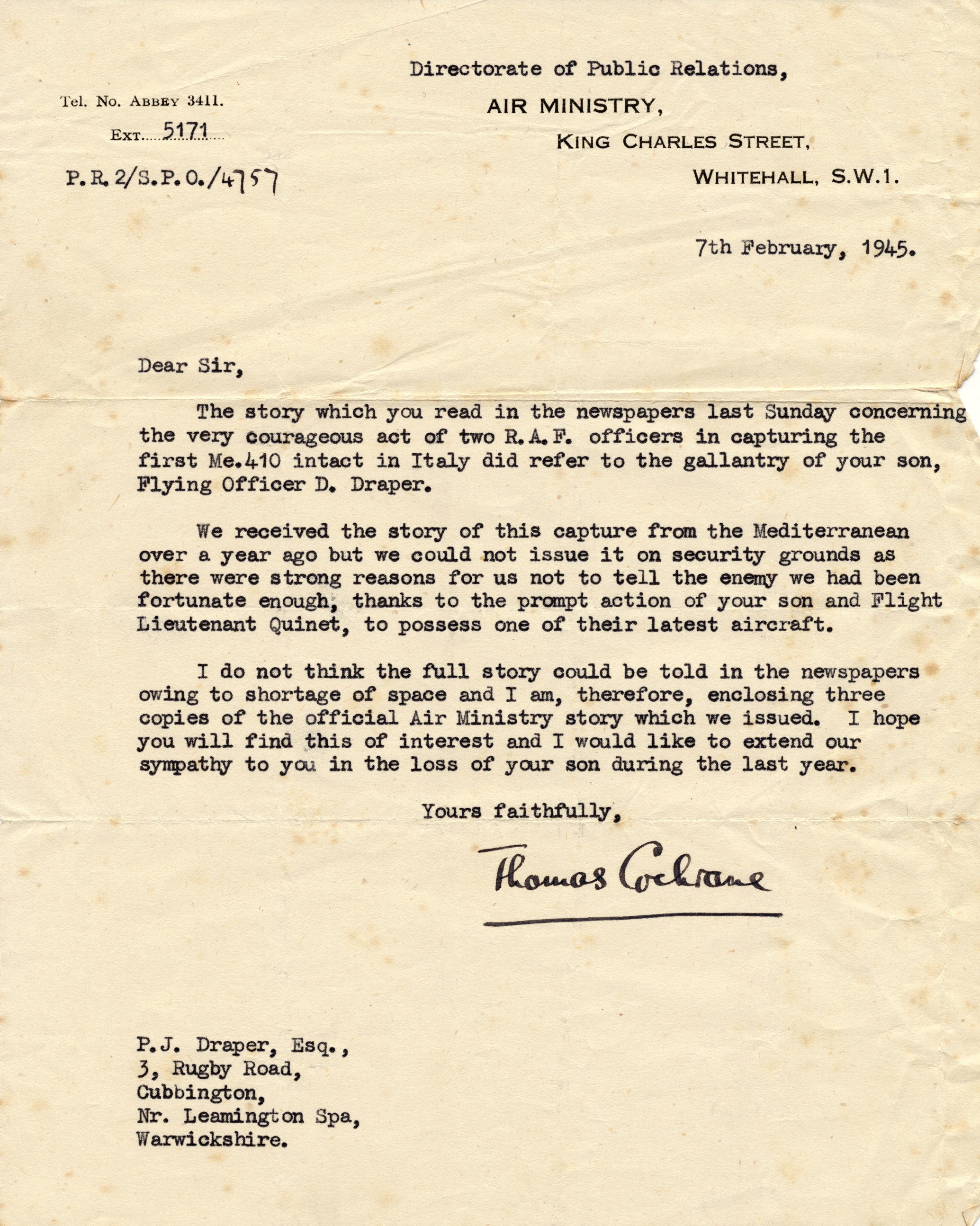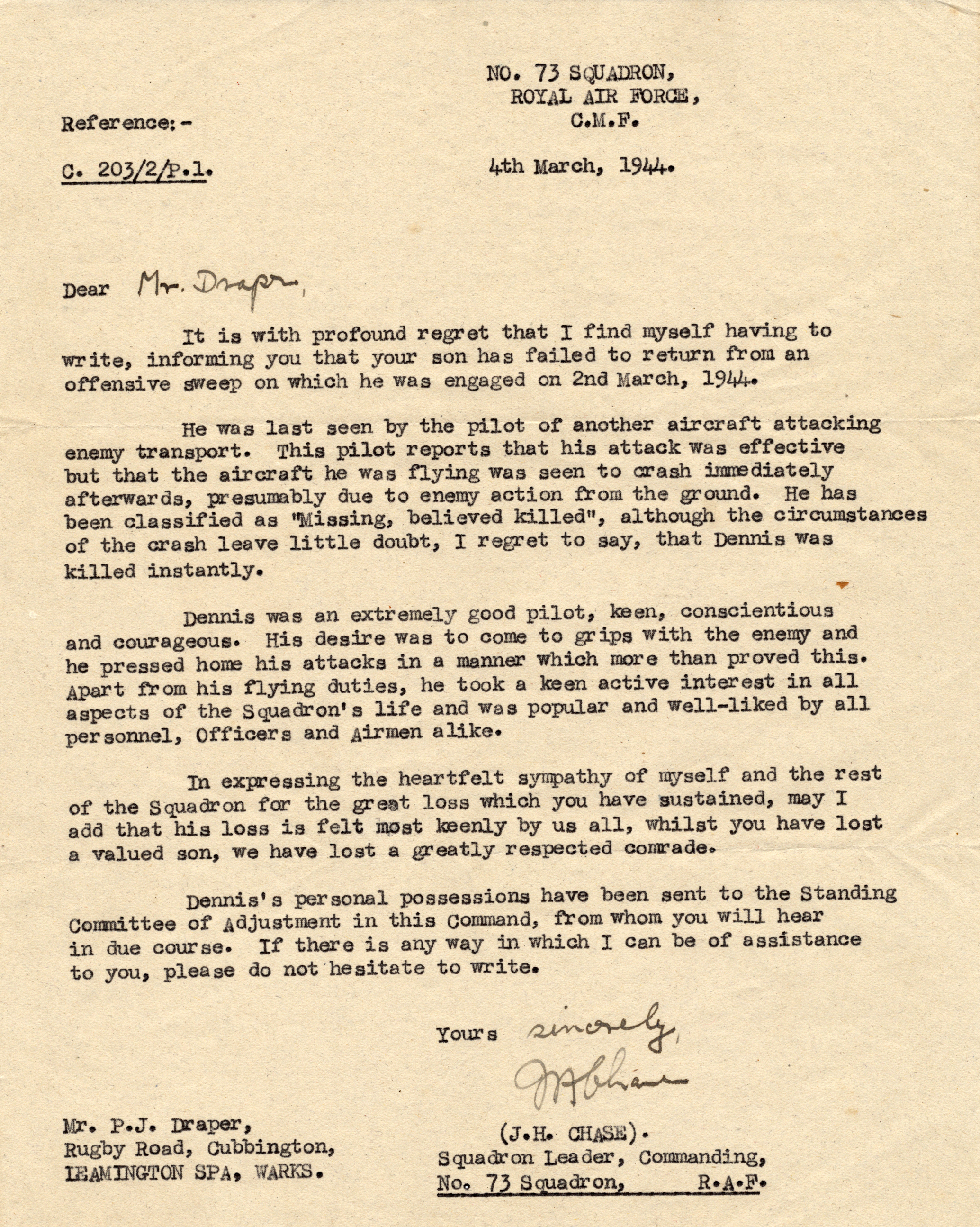 Strafing lorries at Orasac No.1 P/O Darper was killed when he failed to pull up.