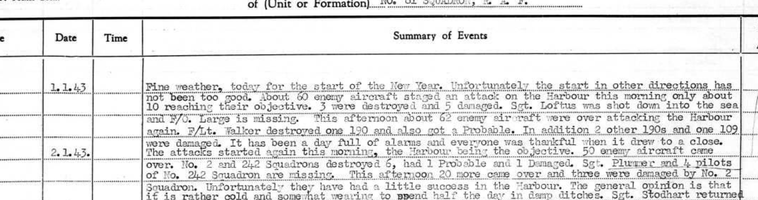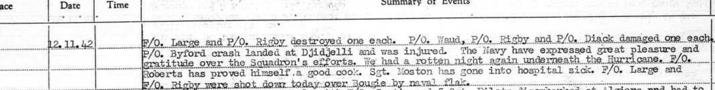 There is some debate as to whether on 1 Jan, 1942 he was shot down into the sea, or, crash landed in ER726 for which a candidate image exists (see our blog post on this matter) as photographed by German forces after ER726 crash landing (also see link for ER726 to the right for date 1943-01-01). His body was never recovered and there is no known grave. On 1-1-1943 two squadron pilots were missing, one KIA, and for F/O Large, the ORB scan to the right simply notes "missing".