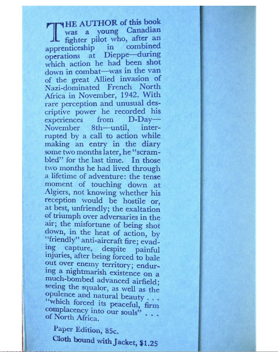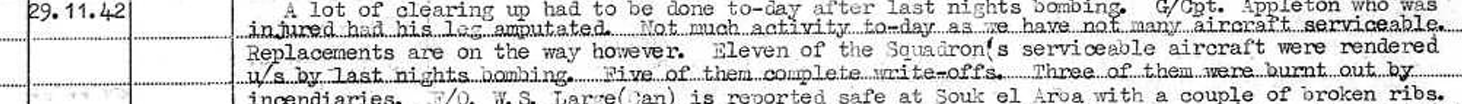 A diary that F/O Large had been compiling was posthumously published in his name, detailing over two months of combat in the Tunisian campaign while in RAF squadron 81. This would contain various combat and living condition details including of one instance of him being shot down and evading with return to squadron (with broken ribs) in the latter part of 1942. Copies of this book surface online for sale time to time, and, may also be in various libraries and archives.