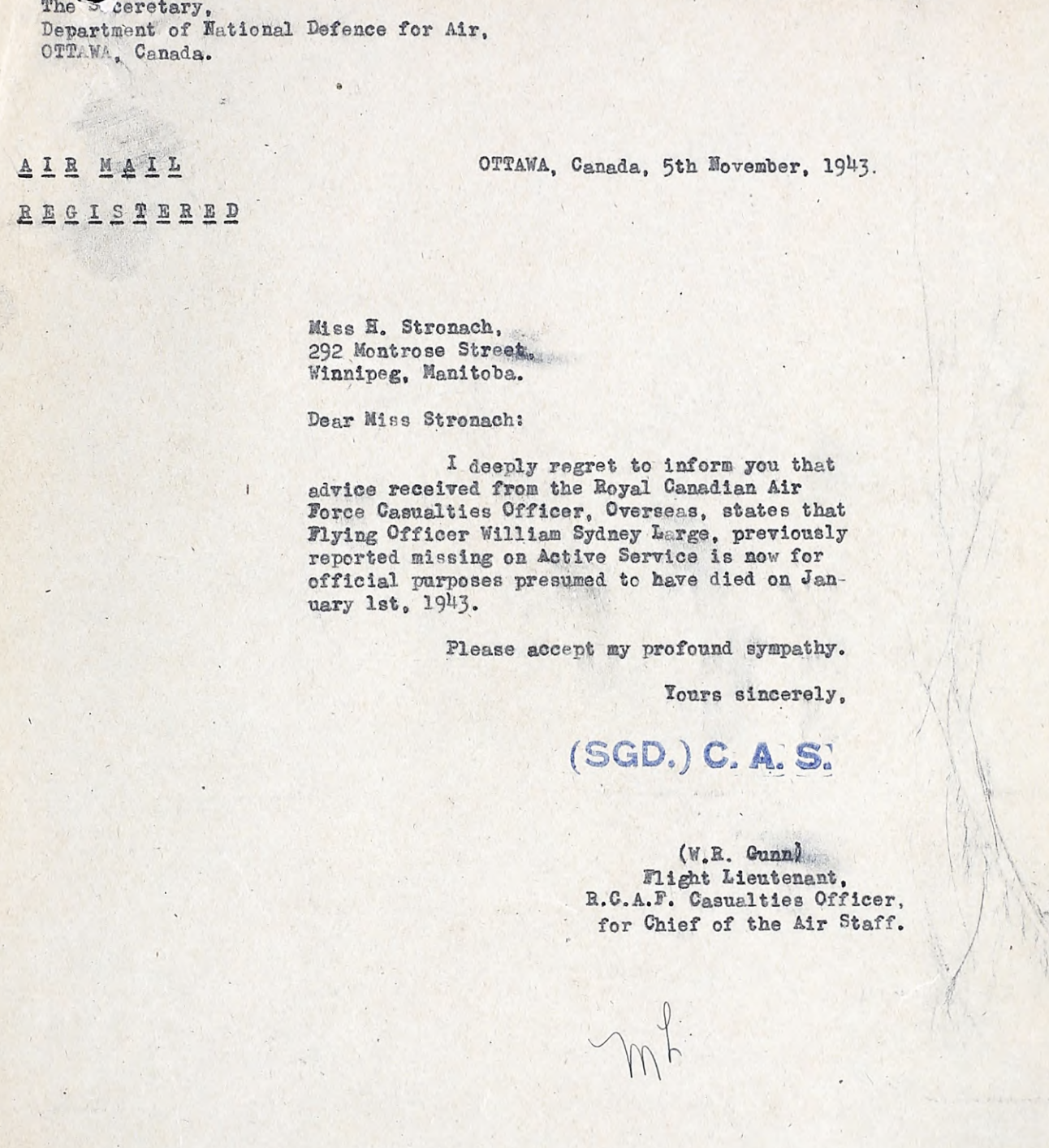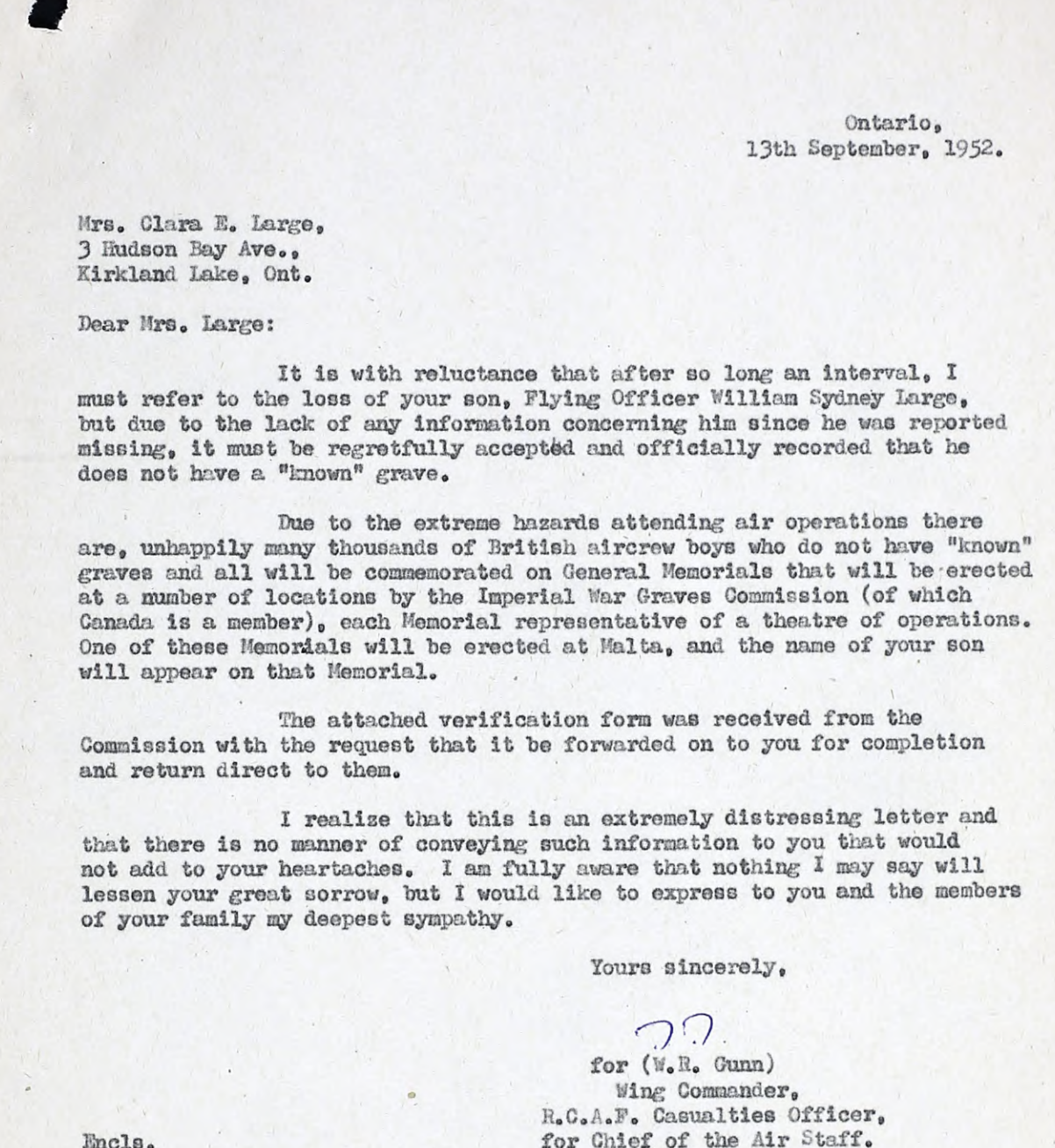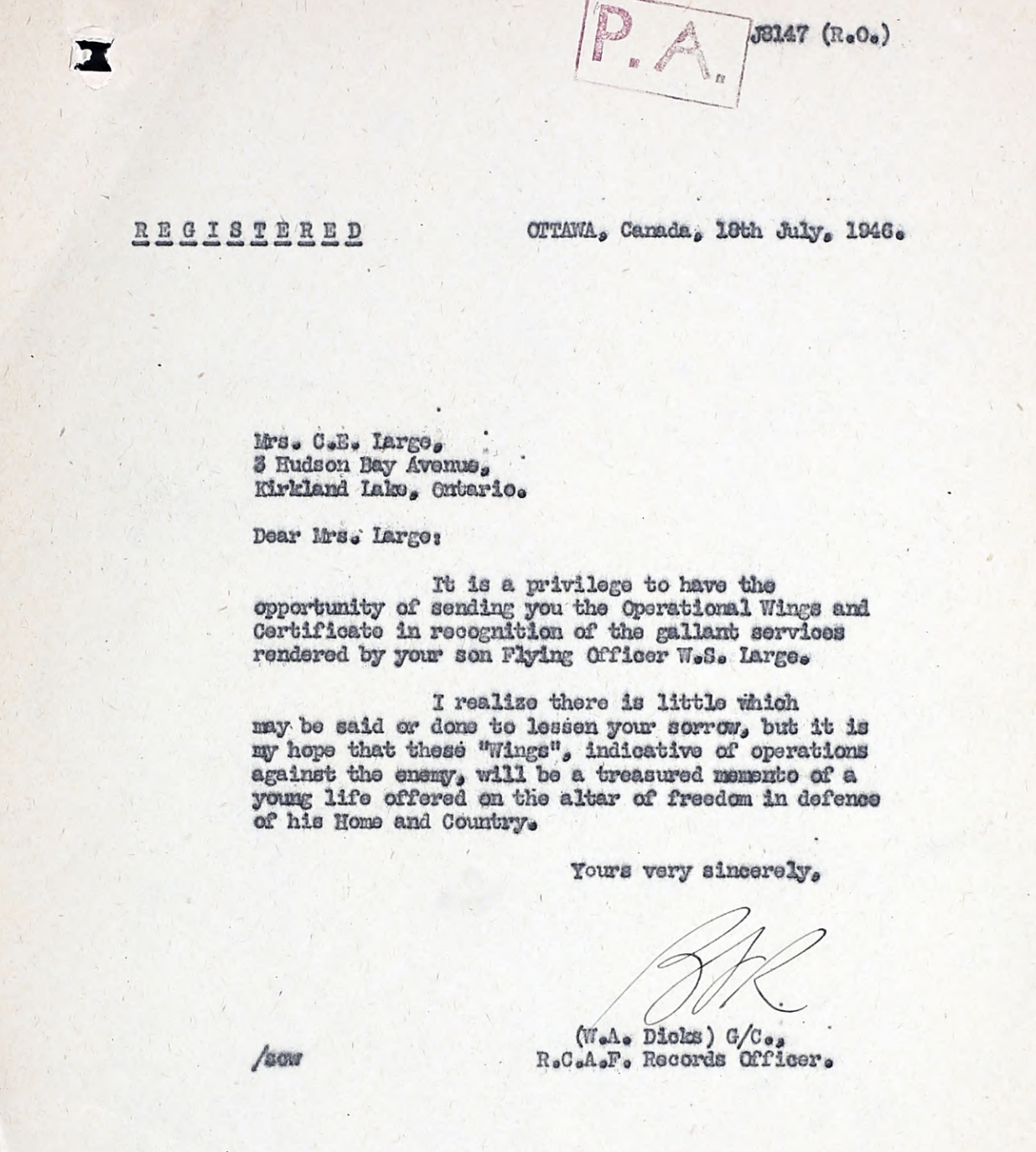 This pilot flew Spitfire fighter aircraft for the RCAF / RAF (60% of all RCAF personnel served in RAF units at some point) in WWII, the initial record we have for F/O Large came from the database of Mr. Halliday, a Canadian military historian.
