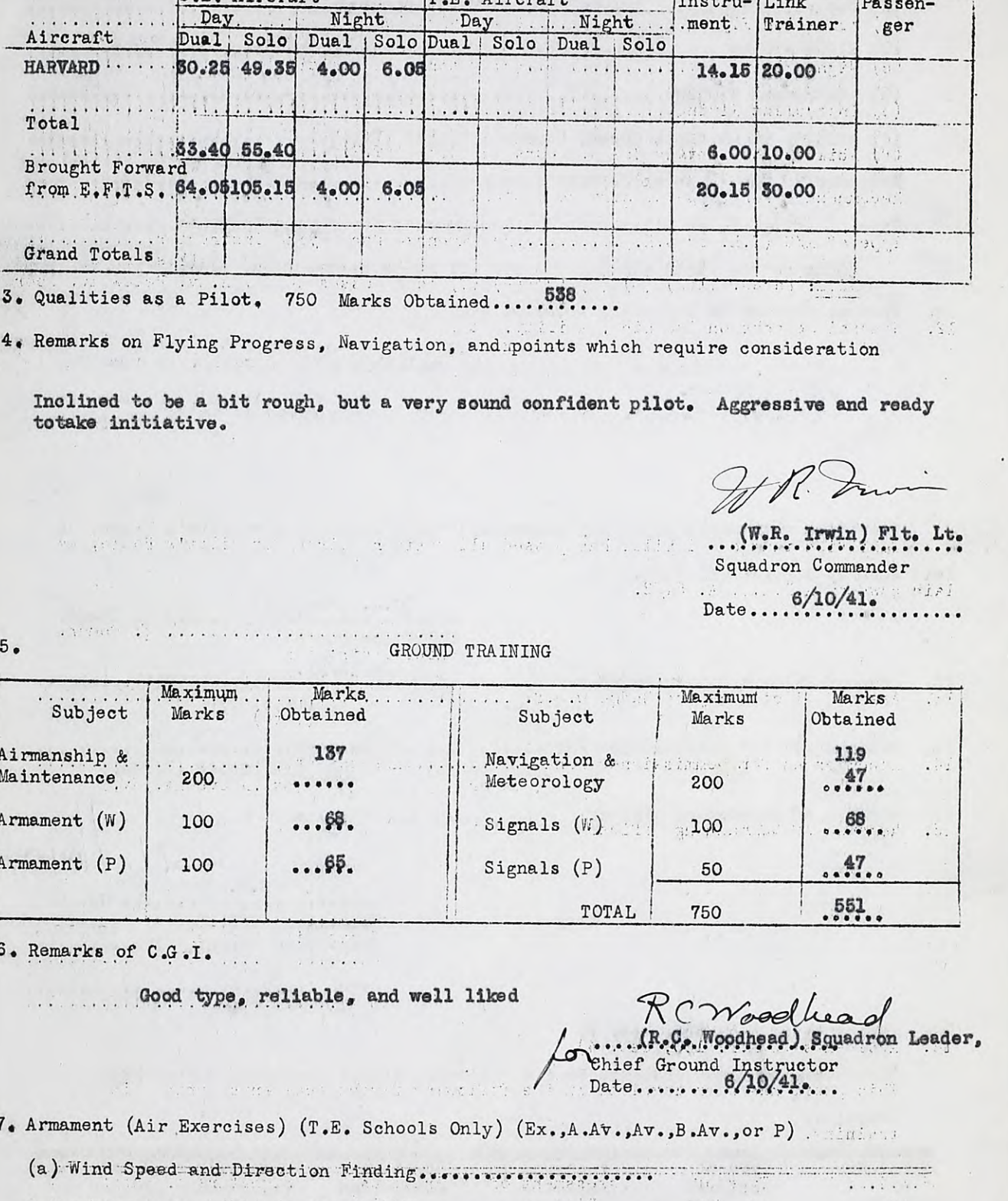 There are snippets of the squadron 81 ORB on the right which give some idea of this pilots activities in late 1942. He was from Kirkland Lake, Ontario (born in AB), single, and was very good at math and his own statements indicate he would have liked to pursue aeronautical engineering with a return to school post-war. Service record scans to the right indicate he was a very good and aggressive pilot, willing to initiate action. ORBs show he had shot down enemy aircraft during operations, and was also credited with at least one probable.